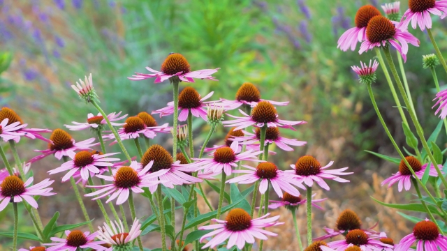 エキナセアは北米原産のキク科の多年草で、一般には「エキナセア」や「パープルコーンフラワー」と呼ばれます。花は中央に盛り上がった円錐状の部分があり、周りに細長い花びらが放射状に広がる姿が特徴です。見た目が美しく庭植えにも向いています。