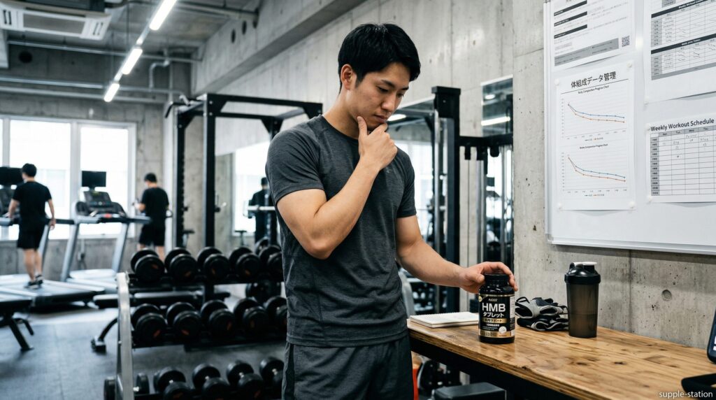 体重が月1kg前後のペースで落ちる状態を作れていない段階では、HMBを追加しても減量の進み方は変わりません。まずは総摂取たんぱく質を体重1kgあたり1.6g以上にし、週3回30分以上の筋トレを行える生活に整えてから、必要かどうかを判断します。