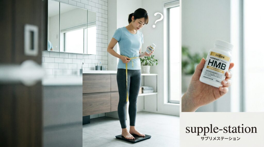 HMBサプリで体脂肪が落ちるかどうかは、まず「食事」と「運動」が整っているかで決まります。1日の摂取カロリーが消費カロリーより300〜500kcal少ない状態を作り、週2〜3回、1回30分以上の筋トレを続けていなければ、HMBを1日3g飲んでも体脂肪はほとんど変わりません。まずは体重を毎日同じ条件で測り、食事量を記録し、体重1kgあたり1.6g以上のたんぱく質を摂ることから始めます。