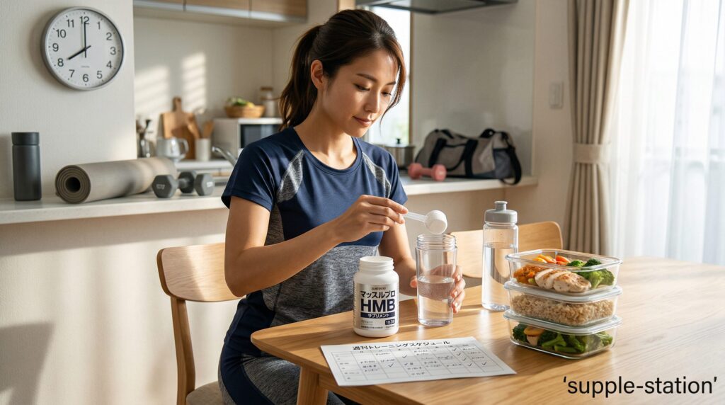 筋トレを行う日は、HMBを合計3gのうち1gをトレーニング開始30〜60分前に摂り、残り2gのうち1gをトレーニング終了後30分以内に摂ります。摂取後に血中濃度が上がるまでに時間がかかるため、開始直前ではなく30分以上前に飲みます。終了後は筋たんぱく質分解が進みやすい時間帯に合わせて摂ることで、分解抑制を狙います。残り1gは就寝前などトレーニングと重ならない時間に摂り、1日の合計を3g前後に保ちます。