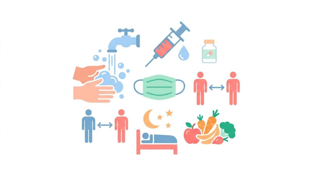 加えて、外出後に石けんで30秒以上手洗いを行い、室内では湿度50〜60%を保ち、毎日6〜7時間の睡眠を確保することで、感染リスクを現実的に下げることができます。