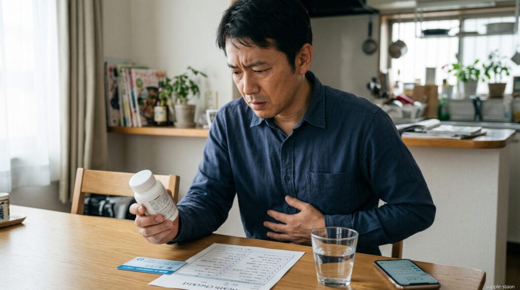 サプリを飲んだあと30分〜2時間以内に腹痛が続く、水様便が1日に3回以上出る、立っていられないほどの吐き気や締めつけるような頭痛が出るなら、その時点で摂取を中止します。毎回同じ製品を飲むたびに全身のだるさが半日以上続く、皮膚に赤い発疹やかゆみが出る状態が2回以上繰り返される場合も継続しません。