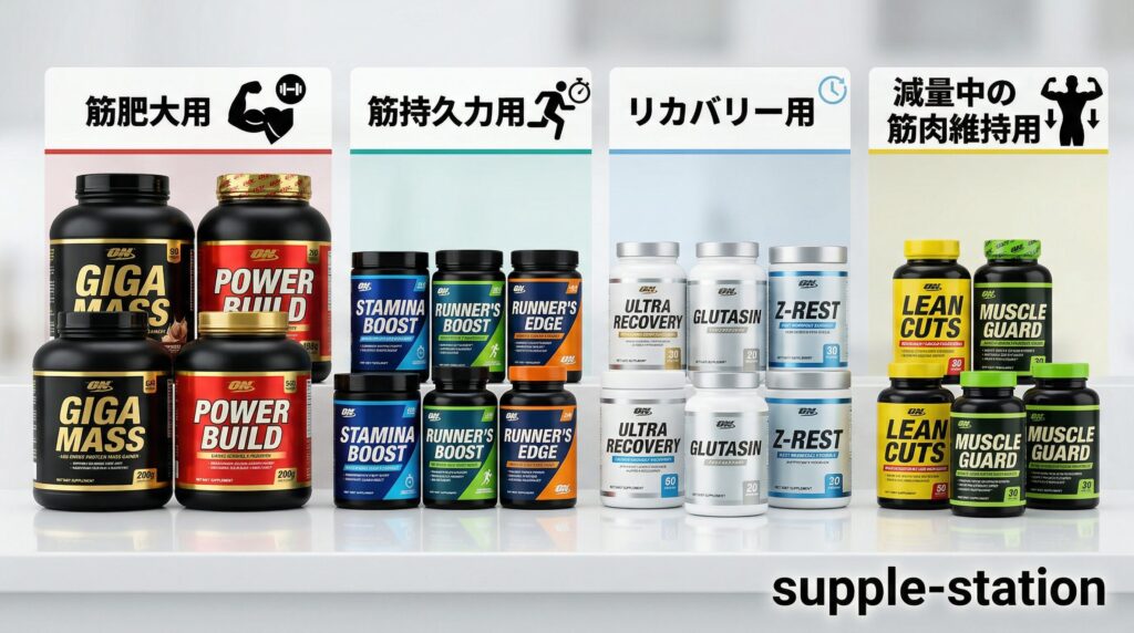 筋肉向けサプリは「とりあえず有名だから」で選ぶものではありません。体を大きくしたいのか、翌日の筋肉痛を軽くしたいのか、扱える重量や回数を伸ばしたいのかによって、選ぶ成分も摂取タイミングも変わります。目的が違えば必要なサポートも変わるため、自分がいま何を優先したいのかを先に決めることが重要です。ここからは、目的別に選び方を整理します。