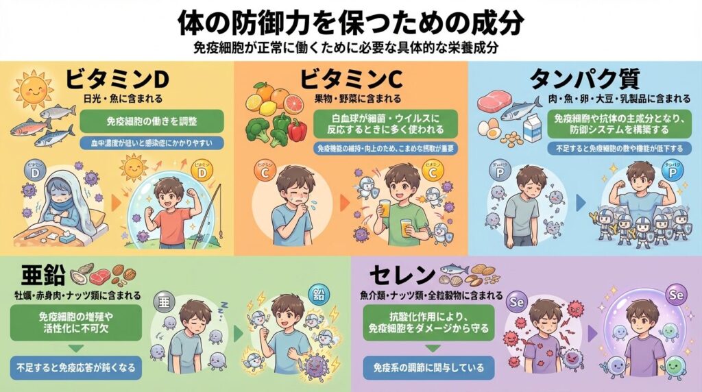 体の防御力を保つための成分には、ビタミンD、ビタミンC、亜鉛、セレン、βグルカンなどがあります。ビタミンDは免疫細胞の働きを調整する成分で、血中濃度が低いと感染症にかかりやすくなることが報告されています。ビタミンCは白血球が細菌やウイルスに反応するときに多く使われる成分で、発熱や炎症時に体内消費量が増えます。亜鉛は免疫細胞の増殖や修復に関わり、不足すると風邪が長引きやすくなります。セレンは抗酸化酵素の材料となり、炎症が強くなりすぎるのを抑えます。βグルカンはきのこ由来の多糖類で、マクロファージなどの免疫細胞を刺激する成分です。これらは体内で免疫細胞が正常に働くために必要な具体的な栄養成分です。