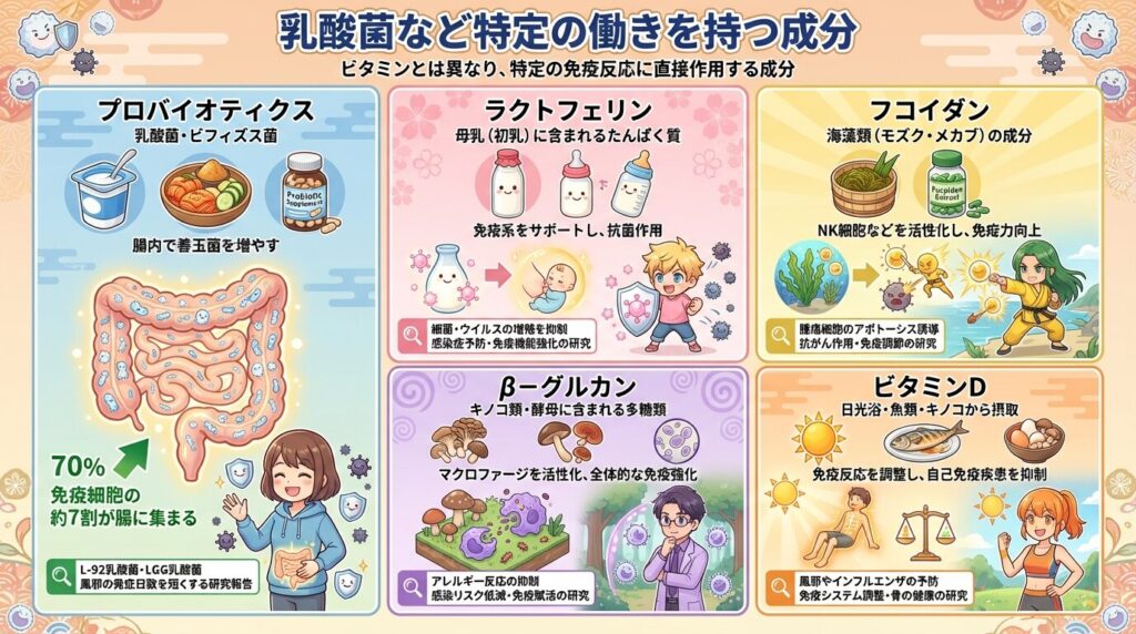 乳酸菌やビフィズス菌などのプロバイオティクスは、腸内で善玉菌を増やし、免疫細胞の約7割が集まる腸の環境を整える成分です。たとえば、L-92乳酸菌やLGG乳酸菌などは、風邪の発症日数を短くする研究報告があります。ラクトフェリンは母乳にも含まれるたんぱく質で、ウイルスや細菌が増えるのを抑える働きがあります。βグルカンはしいたけやパン酵母に含まれる多糖類で、マクロファージなどの免疫細胞を刺激します。エキナセアはハーブの一種で、上気道感染の初期症状を軽減する目的で使われます。これらはビタミンのような基礎栄養素とは異なり、特定の免疫反応に直接作用することを目的に配合される成分です。