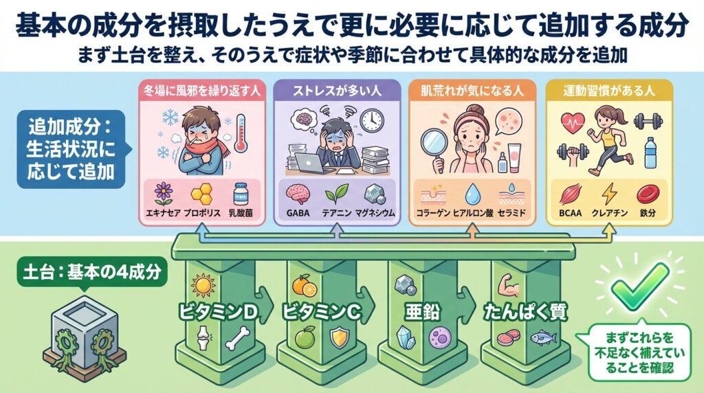 基本の成分を摂取したうえで更に必要に応じて追加する成分