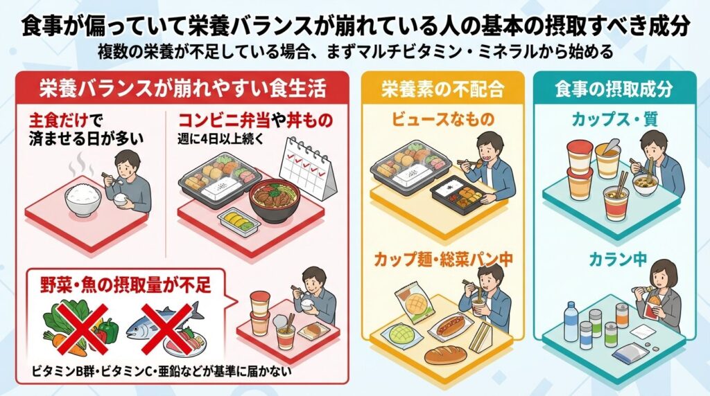 主食だけで済ませる日が多い、コンビニ弁当や丼ものが週に4日以上続く生活では、野菜や魚の摂取量が不足しやすくなります。カップ麺や総菜パンなど加工食品が中心になると、ビタミンB群やビタミンC、亜鉛などの摂取量が基準に届かない状態になります。複数の栄養が不足している場合、ビタミンDだけ、亜鉛だけを追加しても全体の不足は解消しません。まずはマルチビタミン・ミネラルなど、複数成分を一度に補えるものから始めます。