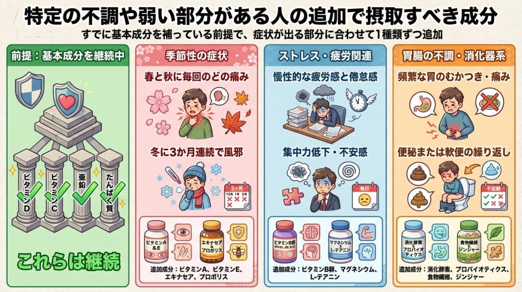 基本の成分を4週間以上補っても、1年に3回以上風邪をひく、特定の季節に毎回のどを痛めるなど傾向がある場合に限り、乳酸菌やβグルカンなど目的別成分を追加します。順番は「土台→追加」です。
