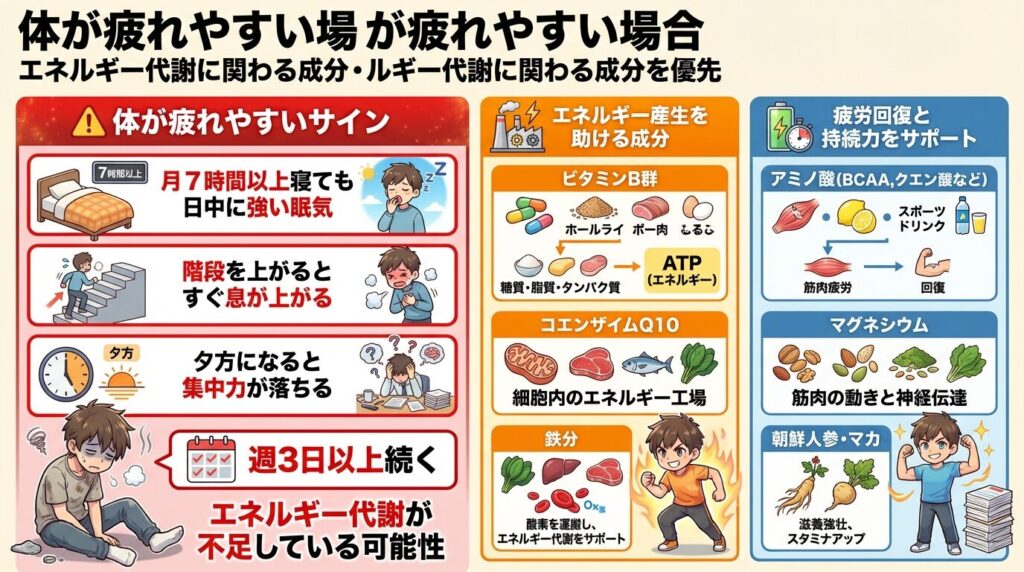 朝7時間以上寝ても日中に強い眠気が出る、階段を上がるとすぐ息が上がる、夕方になると集中力が落ちる状態が週に3日以上続く場合は、エネルギー代謝に関わる成分を優先します。まず鉄を1日10〜15mg、ビタミンB群(B1・B2・B6・B12)を含む製品を選びます。鉄は酸素を運ぶ赤血球の材料になり、不足すると動いたときに疲れやすくなります。ビタミンB群は糖質や脂質をエネルギーに変えるときに使われます。食事量が少ない、朝食を抜くことが多い、肉や魚を週に2回未満しか食べない場合は不足しやすくなります。基本のビタミンDや亜鉛を満たしたうえで、これらの代謝関連成分を追加します。