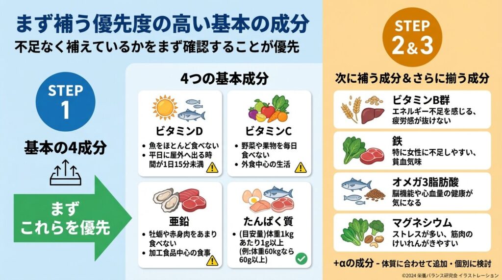 まず補う優先度が高い基本の成分は、ビタミンD、ビタミンC、亜鉛、たんぱく質です。ビタミンDは魚をほとんど食べず、平日に屋外へ出る時間が1日15分未満の人で不足しやすい成分です。ビタミンCは野菜や果物を毎日食べない場合に不足しやすく、外食中心の生活では摂取量が減ります。亜鉛は牡蠣や赤身肉をあまり食べない人で不足しやすく、加工食品中心の食事では十分量に届きにくい成分です。たんぱく質は体重1kgあたり1gが目安で、体重60kgなら1日60gが一つの基準になります。朝食を抜く習慣があると不足しやすくなります。まずはこれらの基本成分を不足なく補えているかを確認することが優先です。