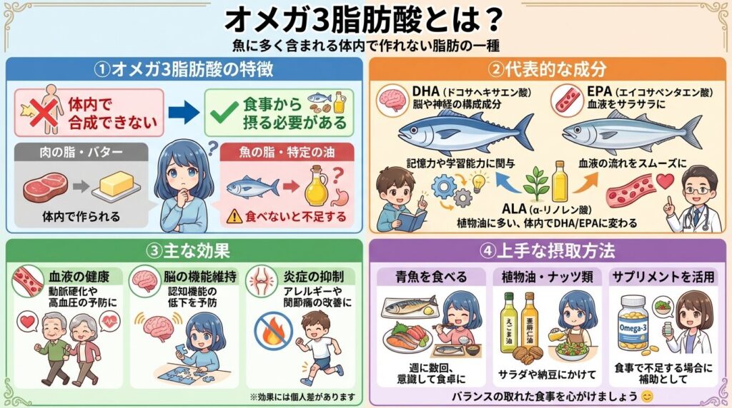 オメガ3脂肪酸は、サバ・イワシ・サンマ・サケなどの青魚の脂に多く含まれる脂肪で、体内では合成できないため食事から摂る必要があります。代表的な成分はEPA(エイコサペンタエン酸)とDHA(ドコサヘキサエン酸)で、焼き魚1切れや刺身1人前程度でも補給できます。植物ではアマニ油やえごま油にも含まれますが、魚に含まれるEPA・DHAとは種類が異なります。肉の脂やバターのように体内で作られる脂とは違い、魚や特定の油を食べないと不足します。