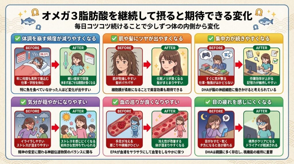 オメガ3脂肪酸を継続して摂ると期待できる変化