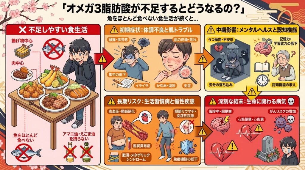 オメガ3脂肪酸が不足すると、まず魚をほとんど食べない食生活の人に多い「脂質の偏り」が起こります。揚げ物や肉中心の食事が続くと、血液中の中性脂肪が増えやすくなり、健康診断で数値が高く出ることがあります。また、肌が乾燥しやすくなる、目が疲れやすい、集中力が続きにくいといった変化を感じる人もいます。長期間不足した状態が続くと、動脈硬化の進行や心血管系の病気のリスクが高まることが知られています。魚やアマニ油・えごま油をほとんど摂らない食事を続けている場合は、不足している可能性が高くなります。