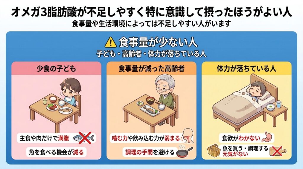 食べる量そのものが少ない人は、魚を食べる機会も減るためオメガ3脂肪酸が不足しやすくなります。例えば、子どもが少食で主食や肉だけで満腹になる場合や、高齢者が一度に食べられる量が減って焼き魚を半分しか食べられない場合は、EPAやDHAの摂取量が足りなくなります。発熱後や病後などで体力が落ちているときも、あっさりした物しか食べられず魚を避けがちになるため不足しやすくなります。このような場合は、少量でも食べやすいサケのほぐし身やサバ缶を小分けで使う、やわらかく煮た魚を取り入れる、食事が難しい日はEPA・DHA配合のサプリメントを利用するなどして補う必要があります。