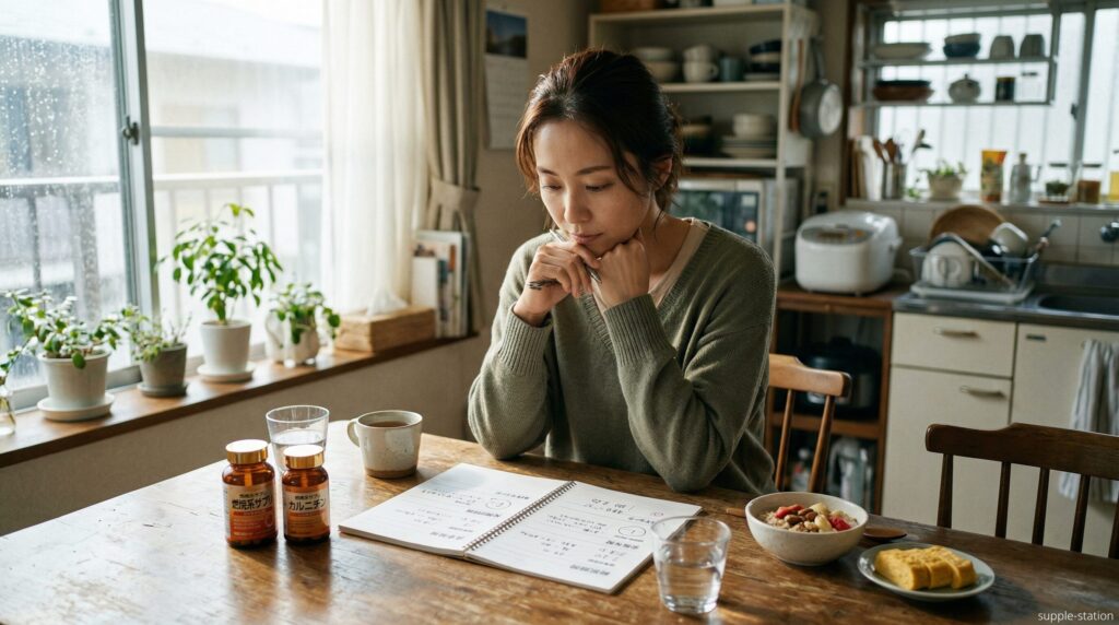 服用中の薬の名前と1日の用量を把握し、次回の診察日を待たずに医師または薬剤師に成分名と含有量を伝えて確認できる状態でなければ、サプリは開始しないと判断します。