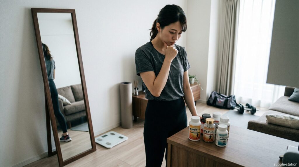 脂肪燃焼サプリを使うかどうかは、まず自分が週に何回・何分くらい運動しているか、1日にどれくらい食べているかを確認するところから始めます。週2回未満で運動時間が1回20分以下、食事量も記録していない状態では、サプリを足しても体脂肪1kgを減らすために必要な約7,200kcalの消費差は作れません。
